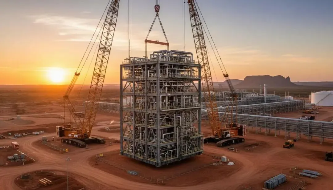 配图描述:澳大利亚荒漠地区液化天然气厂区工业景观下,一座大型天然气液化工艺模块矗立其间。
