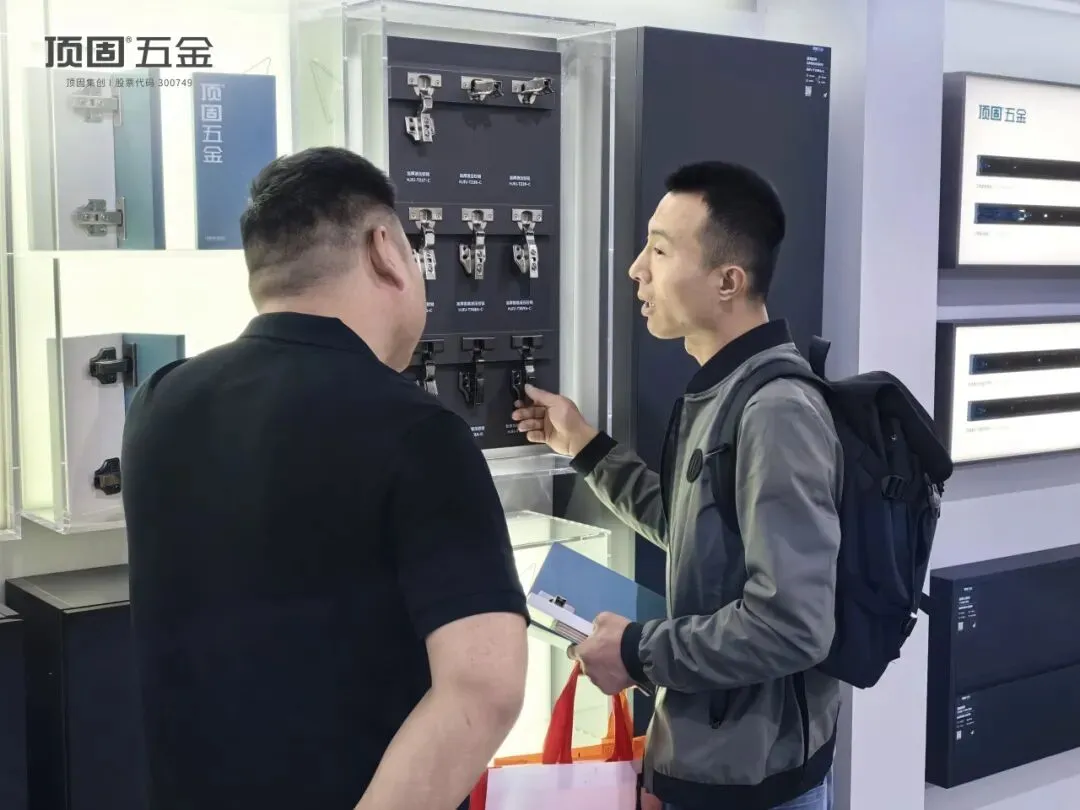 展会现场,顶固五金以全新升级的六大系统构建了完整的产品生态——基础五金系统、门用五金系统、移门五金系统、橱柜收纳系统、衣柜收纳系统及灯光型材系统,展现出强大的系统化集成能力。展位内人头攒动,客商云集,专业观众围绕新品进行深入交流,充分印证了顶固五金在行业内的品牌号召力与市场认可度。