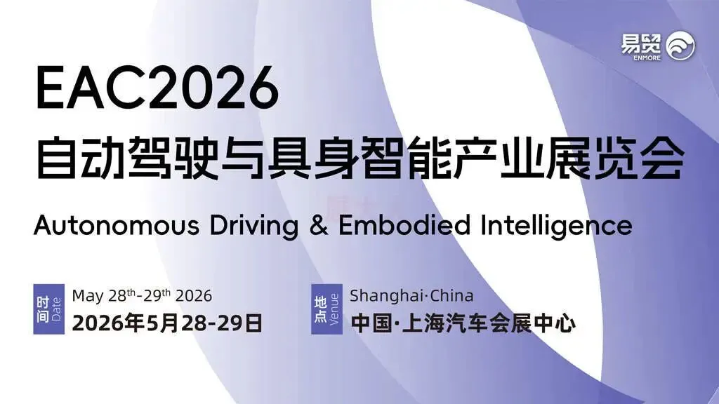 2026年5月28-29 日,上海汽车会展中心,EAC2026 自动驾驶与具身智能产业展览会重磅升级!EAC2026以“大会+展览”双核模式,打造一站式价值对接超级平台,全景呈现自动驾驶与机器人智能感知的全产业链的技术盛宴,本届展览会同期将汇聚120+核心展商展示,120+演讲嘉宾分享,10000+专业观众参与,全面展示自动驾驶与机器人核心领域的创新成果。