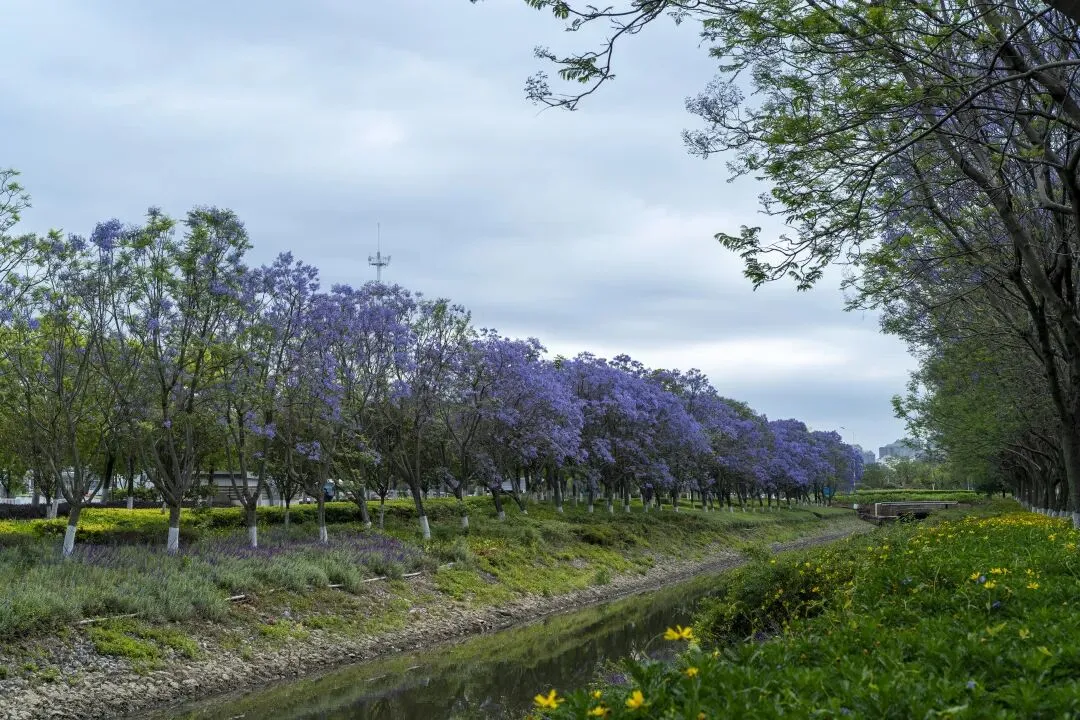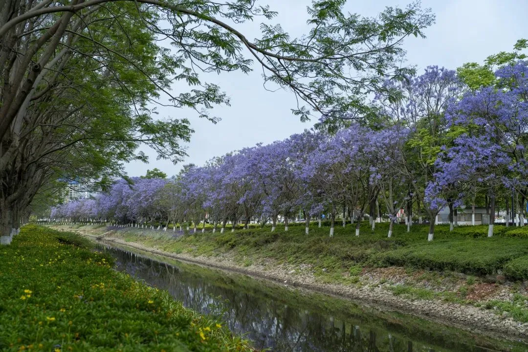 在会展中心附近,有一条静谧的河道。微风拂过,水面泛起层层涟漪,倒映着岸上如烟似雾的蓝色花朵。那一刻,时间仿佛被按下了暂停键。树干底部刷着整齐的白漆,像是给这片紫色的森林镶上了一道素雅的边。绿草地上点缀着细碎的小黄花,与满树的蓝紫形成冷暖交织的画卷。