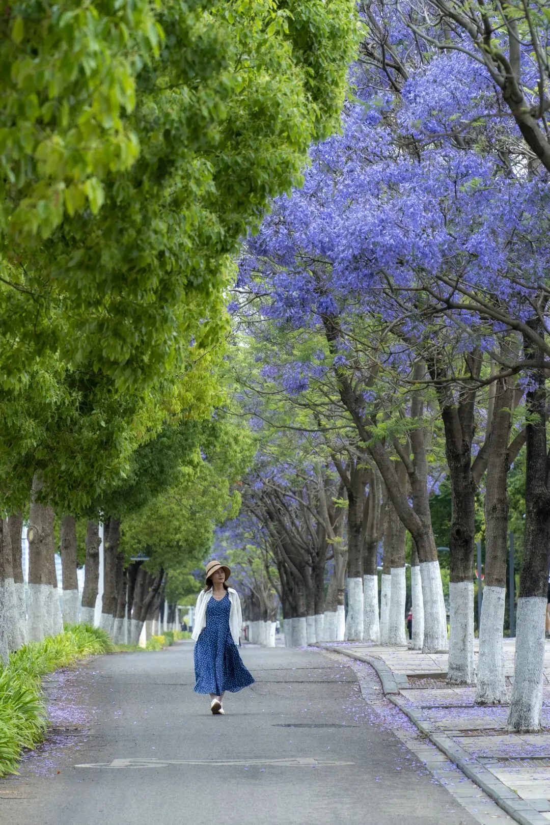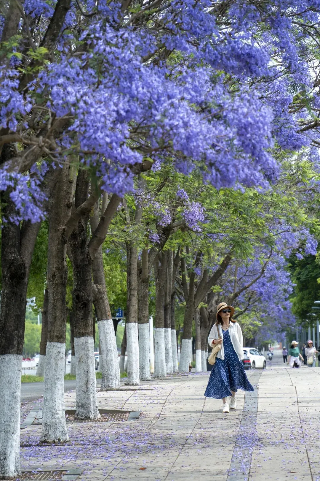 在昆明会展中心,你可以看到它盛开时满树繁华的热烈,也能看到它飘落时铺天盖地的浪漫。人行道上、草地上,都落满了花瓣,像是下了一场紫色的雪。踩上去软软的,几乎听不见声音。
