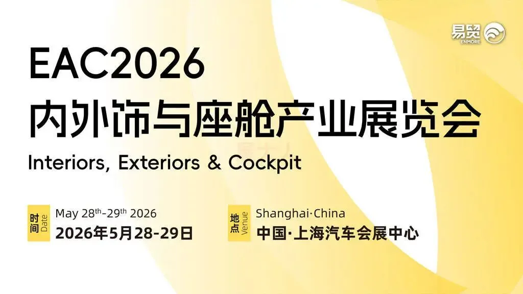 EAC2026 内外饰与座舱产业展览会将以 “AI 赋能・生态创新” 为主题,于5 月 28-29 日在上海汽车会展中心举办,本届展会通过展览展示、专业论坛、闭门沙龙、奖项评选、产业考察等30+展期活动,链接超8000+主机厂/T1系统总成/T2零部件企业/T3材料与方案解快服务商/协会高校等高层决策人/研发/产品/设计/质量等部门专家,推动AI驱动下的融合应用与生态构建打造贯穿“材料、零部件、系统集成”的中国供应链秀场。