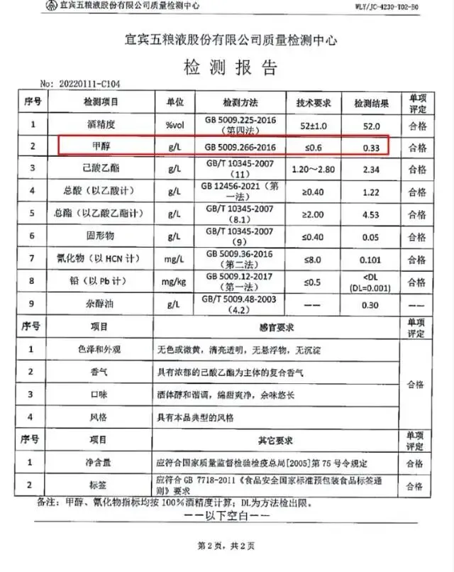 另一款同样如雷贯耳的一线名酒,它的检测报告显示,甲醇含量是:0.33g/L。