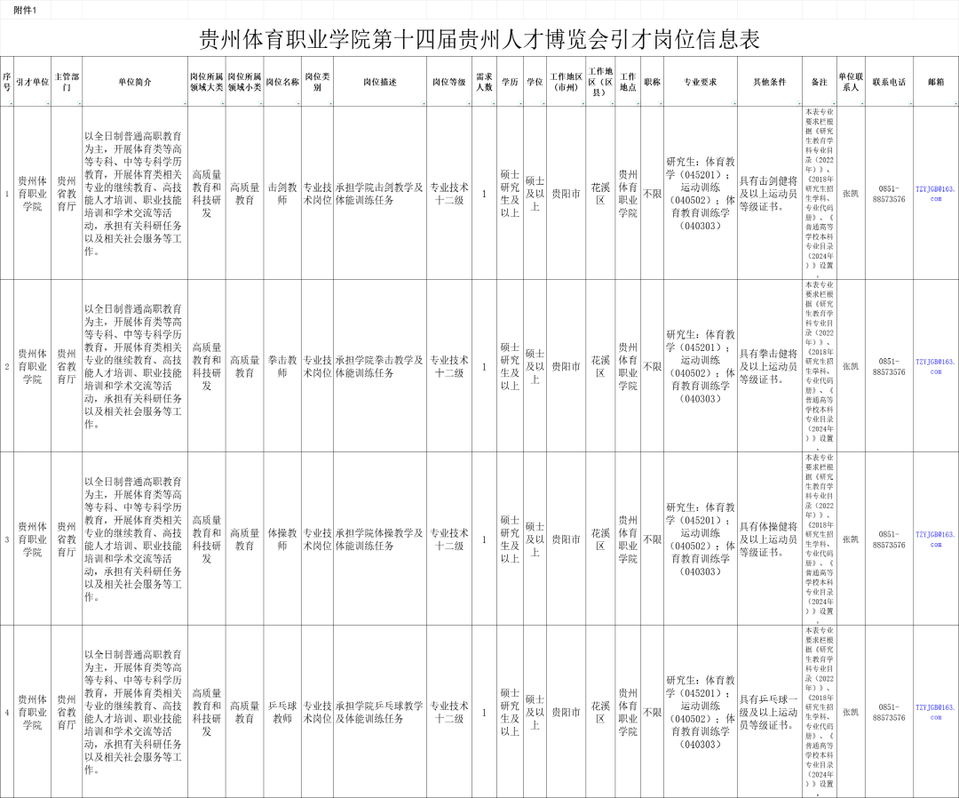 面向社会公开引才4名,具体岗位及要求见《贵州体育职业学院第十四届人才博览会引才岗位信息表》(附件1)。