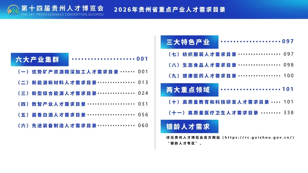 为深入贯彻落实省委省政府决策部署,强化构建具有贵州特色的现代化产业体系的人才支撑与智力支持,第十四届贵州人才博览会组委会办公室紧扣重点产业关键领域的用人单位实际需求,编制发布了《2026年贵州省重点产业人才需求目录》(以下简称《目录》),旨在为全省各地各部门(单位)及广大人才提供参考指引。