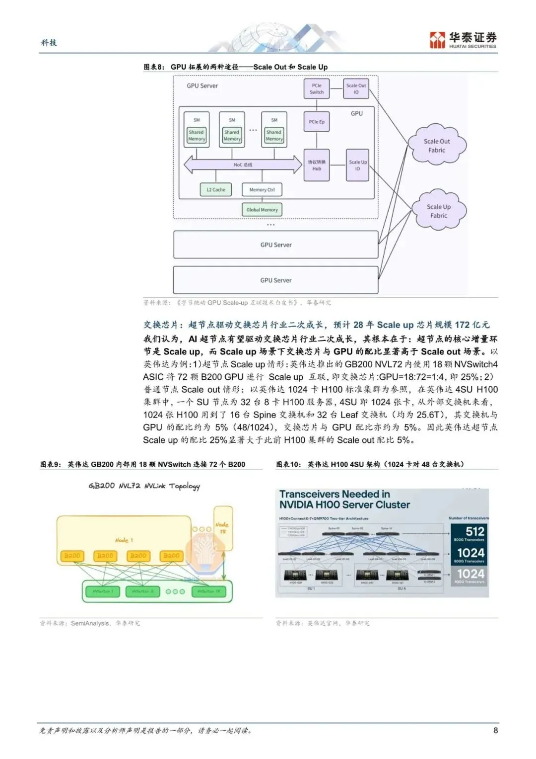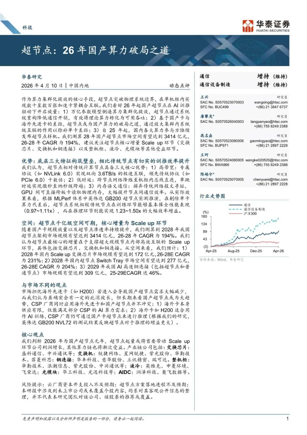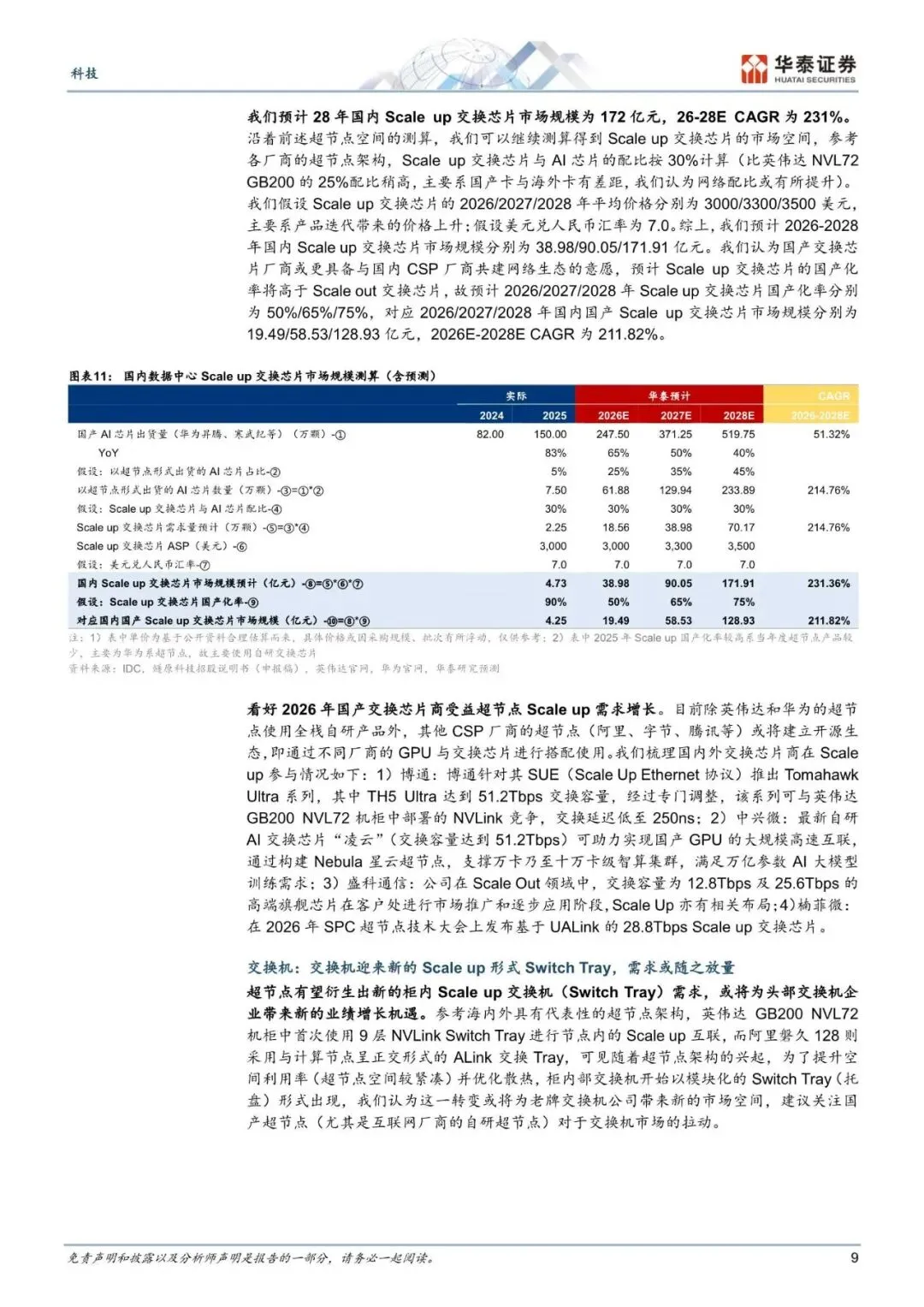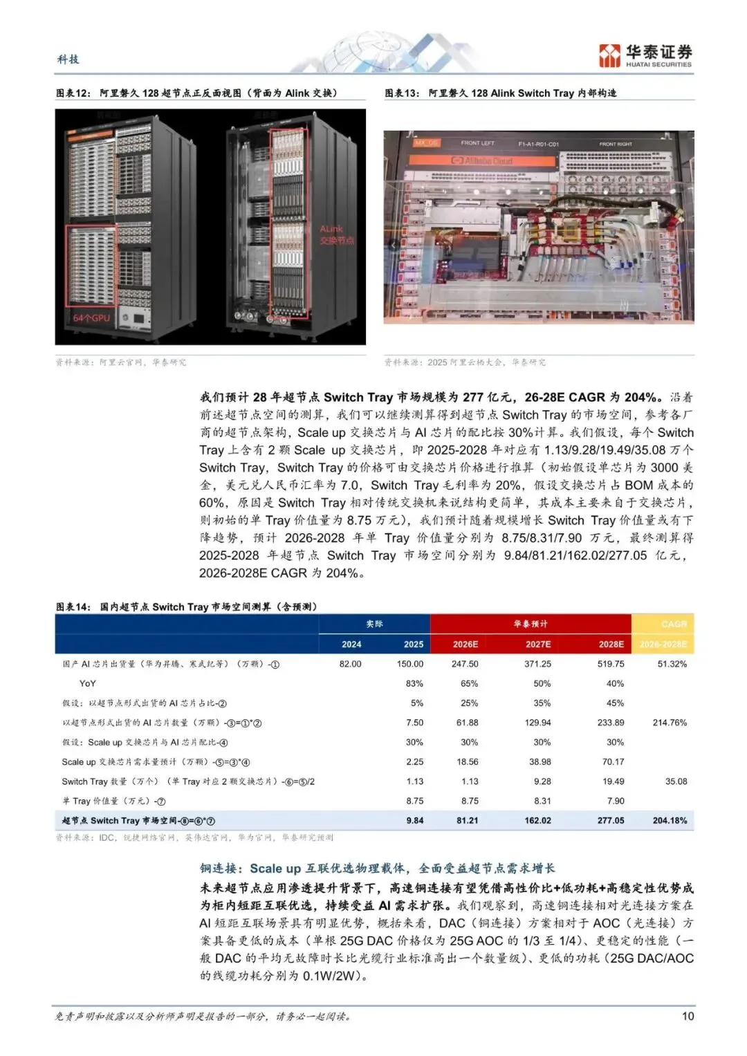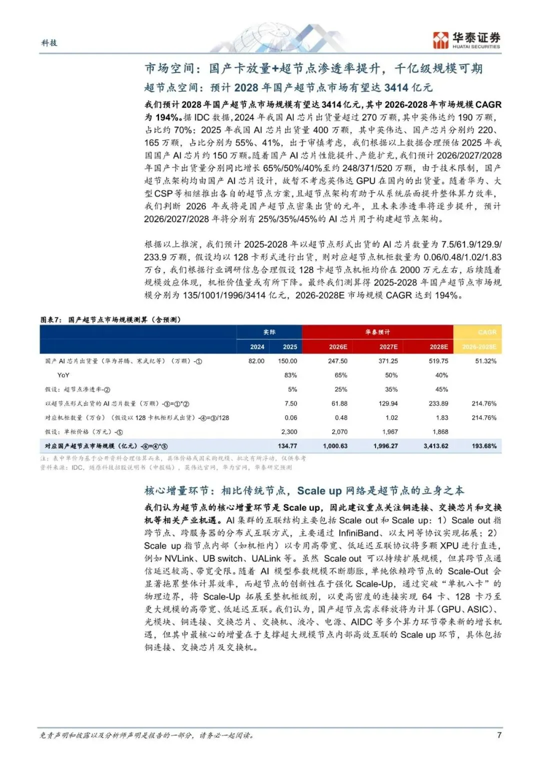 3)自 25 年起,国内各大算力参与方陆续发布超节点样机。我们测算 28 年国产超节点市场空间有望达到 3414 亿元,26-28 年 CAGR 为 194%,建议关注超节点核心增量 Scale up 环节(交换芯片、交换机和铜连接)以及整机柜、液冷、光模块等其他受益环节。