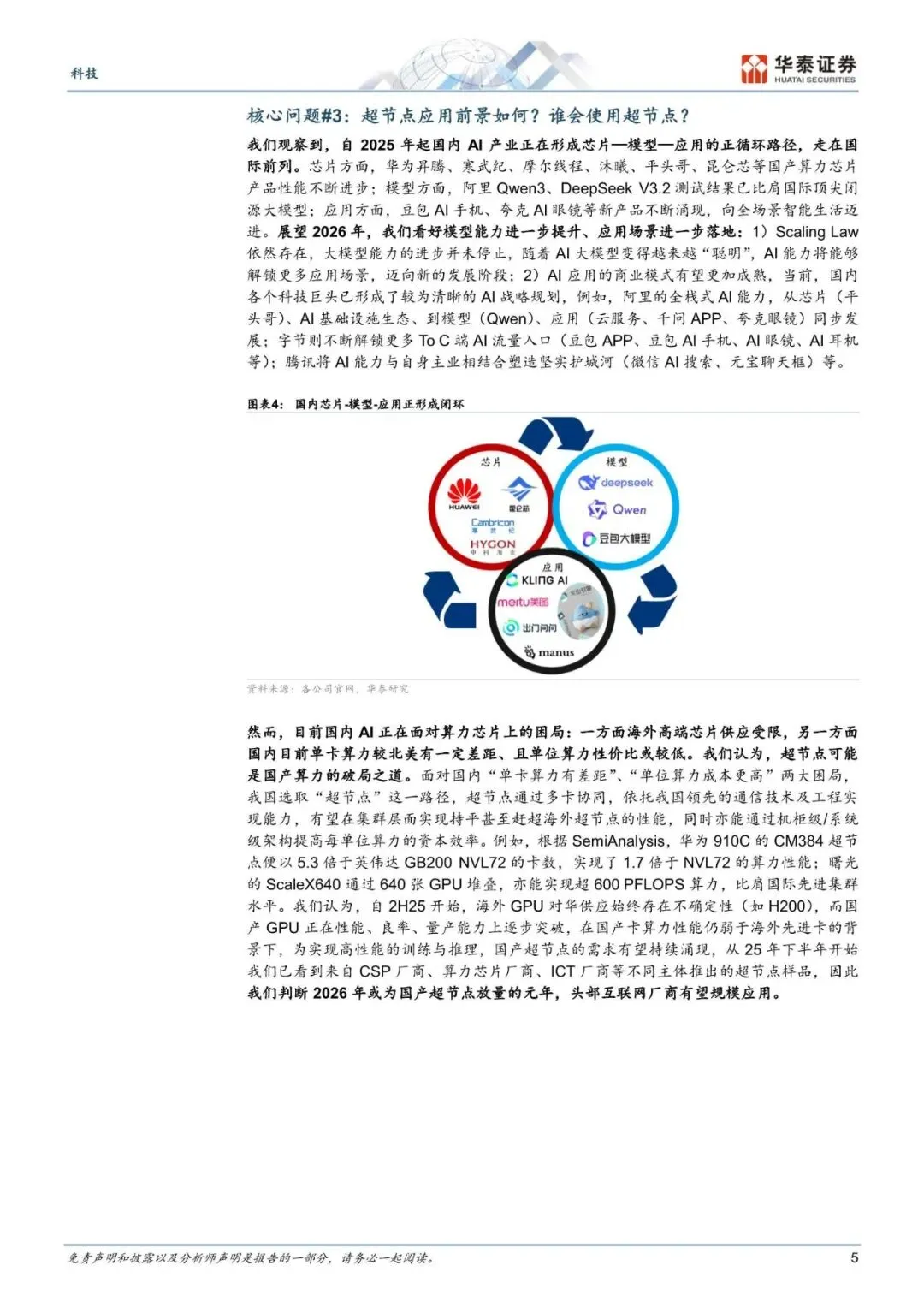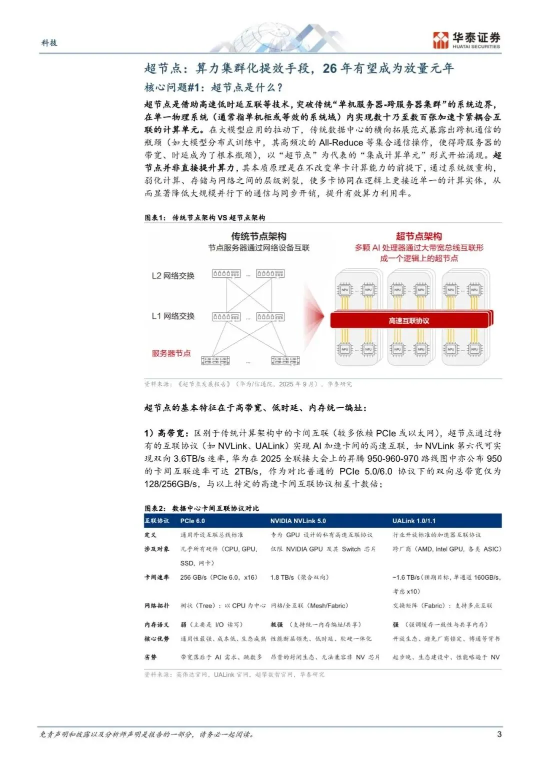 作为算力集群化提效的核心手段,超节点突破物理系统边界,在单机柜内实现数十至数百张加速卡紧耦合互联。我们看好 26 年起国产超节点在 AI 训推驱动下开启放量: