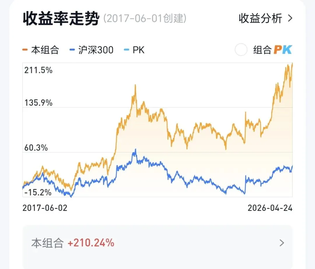 二,股票组合,自2017年6月1日起,至今收益为+210.24%。同期沪深300指数收益为36.37%。本组合领先同期沪深300指数173.87个百分点。