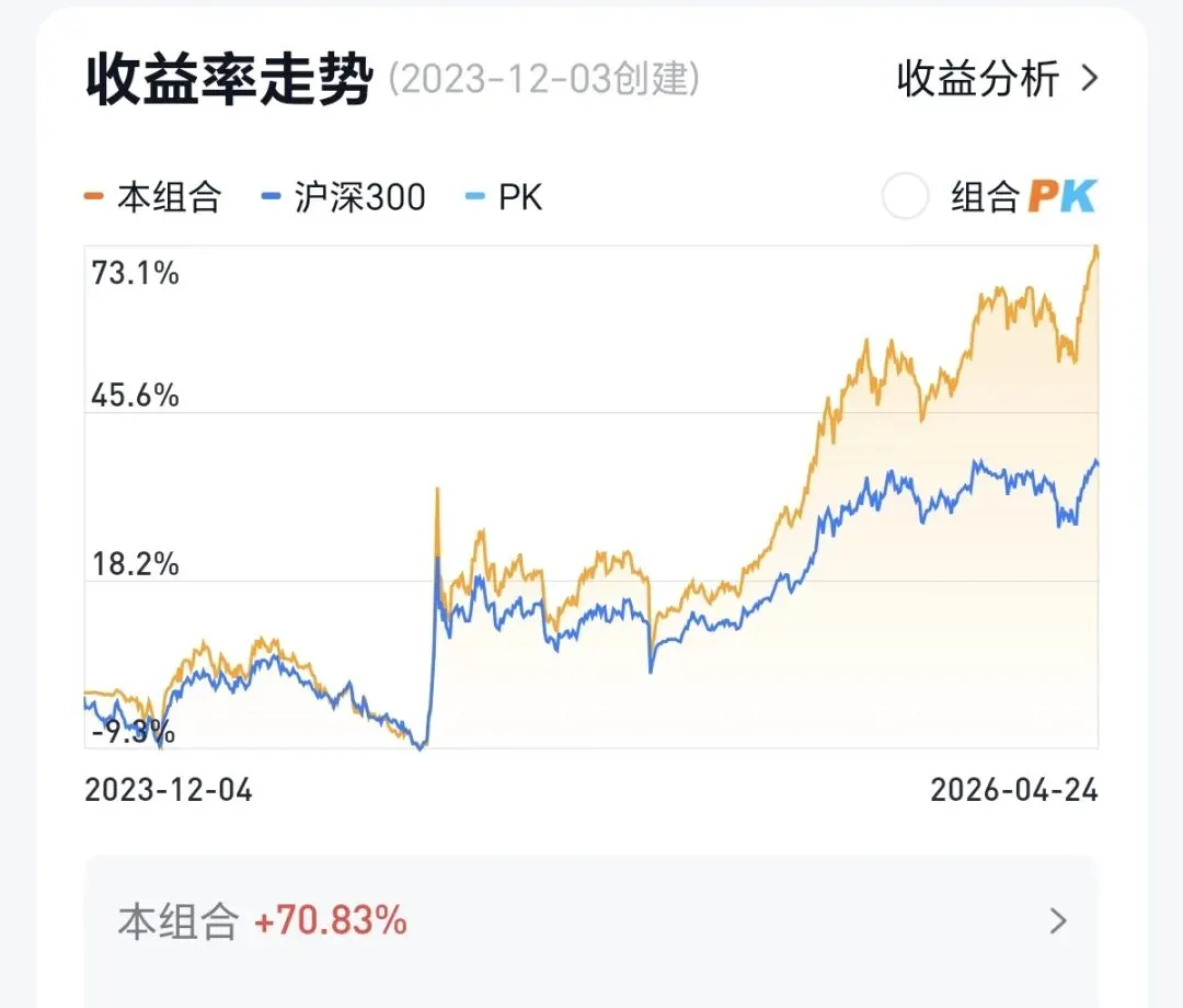 一,指数基金组合,自2023年12月3日起,至今收益为+70.83%。同期代表全市场的中证全a指数收益为38.89%。本组合领先中证全a指数31.94个百分点。