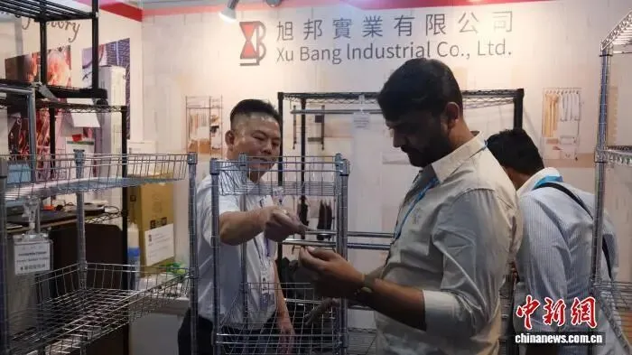 “这款产品支持多档位高度自由调节固定,适配同规格铁管通用拼装,结构设计实用便捷,目前该项功能已在台湾取得专利认证。”在旭邦实业有限公司的展位上,该公司执行长吴旻锭向境外采购商展示新款可调节式五金产品。