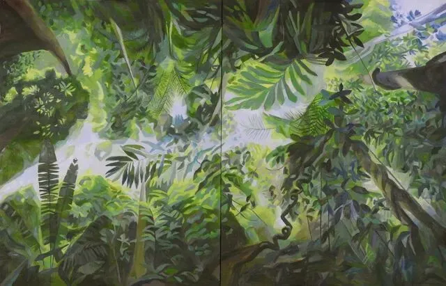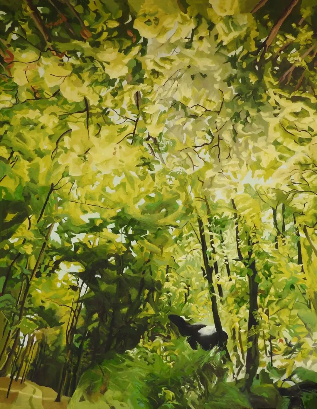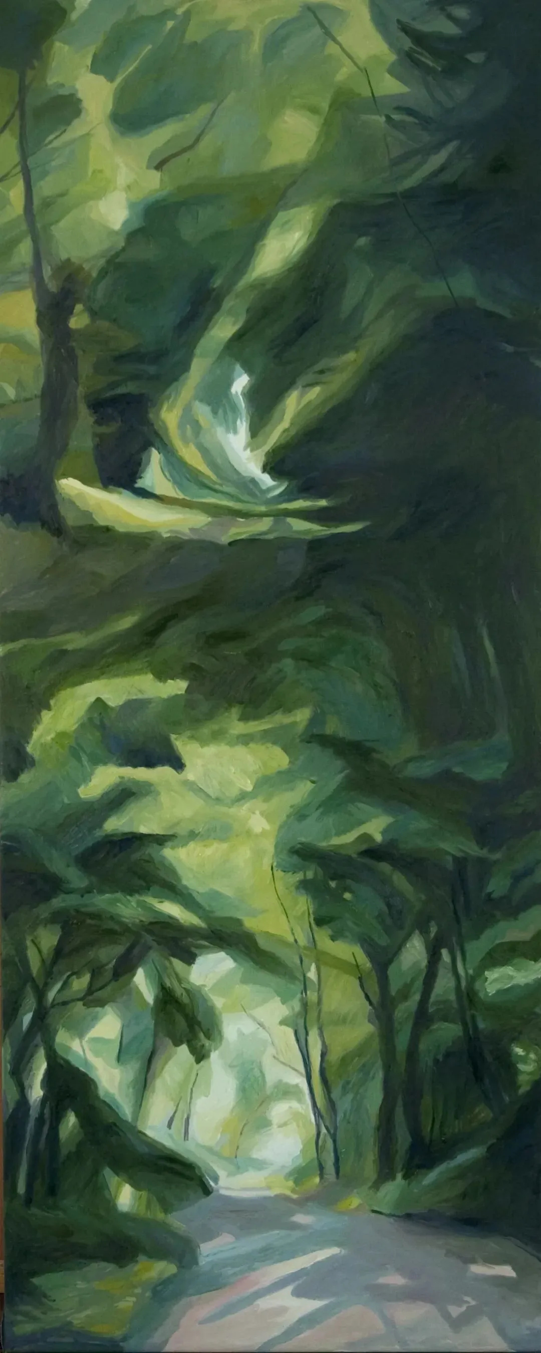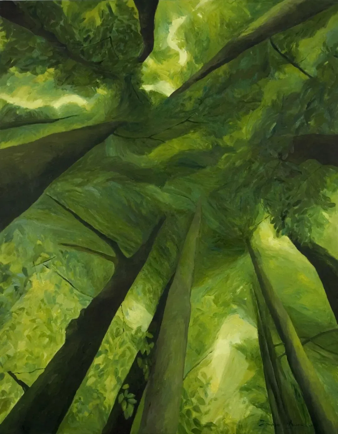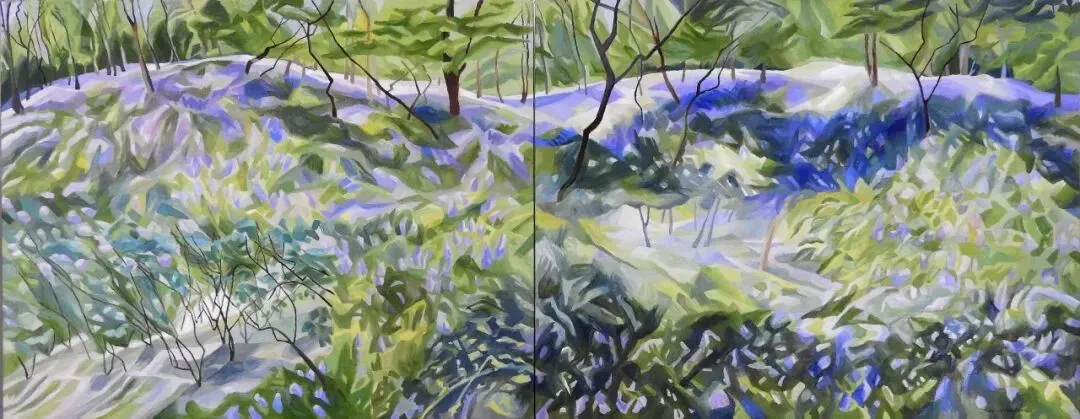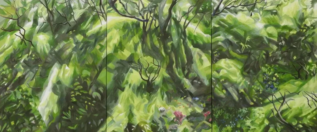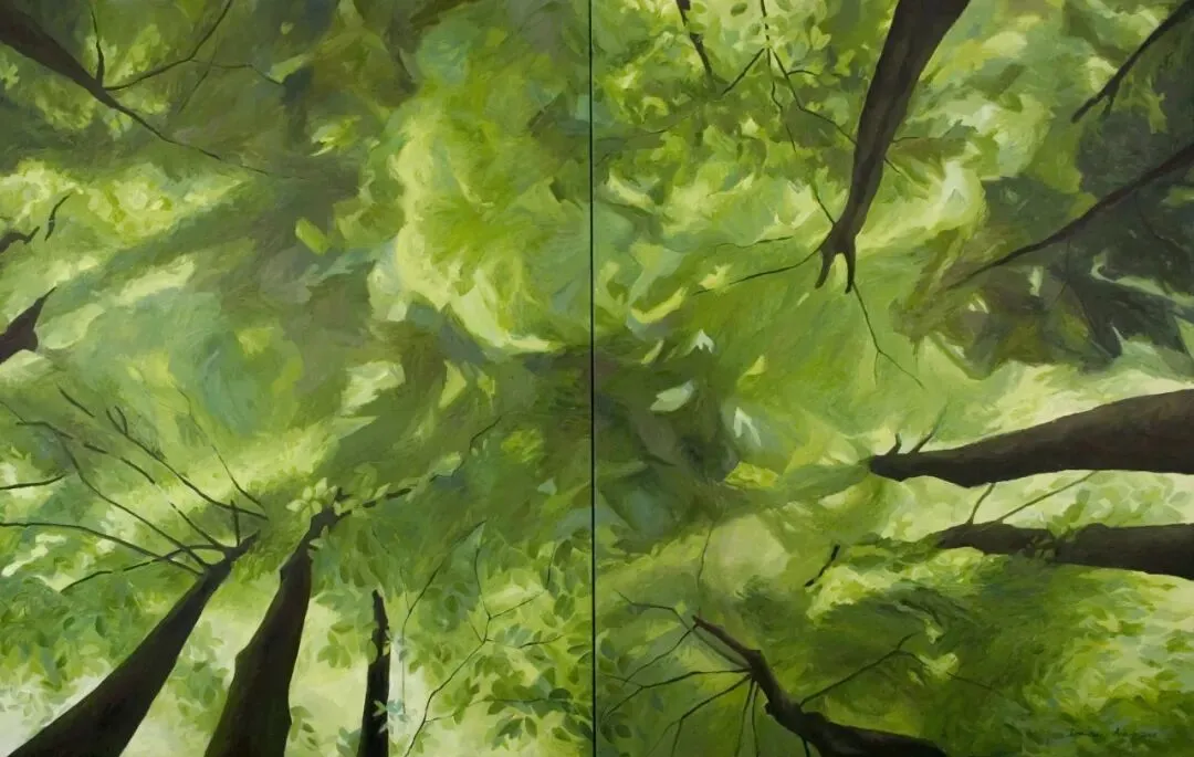 艺术家笔下的林海植被、林间光影、自然景致,从不是单纯的风景复刻,而是封存岁月的记忆与心境。她热爱徒步写生,于自然间捕捉蓬勃生机,又在工作室里重构记忆里的光影变幻。在绿植意象的画面建构中,她将俯视与仰视视角、放大与缩微视野并置、拼贴、衔接,打破平面画面的局限,构建出连续且独特的光线轨迹。这种对传统线性透视光影法则的突破与重构,对光线方向、绿植形色与画面肌理质感的统合与把控,让眼前的自然景致与内心的精神意象相融,衍生出略带魔幻性的独特视觉效果。这般绘画境界,恰恰契合中国唐代画家张璪所言“外师造化,中得心源”的艺术真谛。她笔下的绿色世界,既源于生生不息的自然万象,又超脱于具象描摹,尽显世间万物本真的精神性与抽象力量。