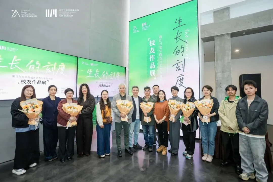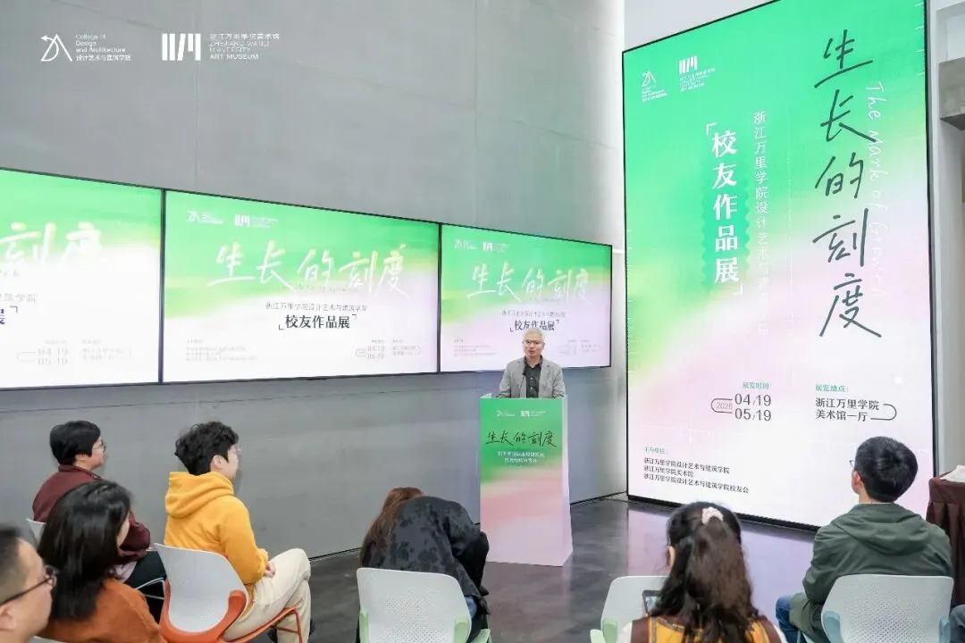 傅立新宣布展览正式开幕。随后,全体嘉宾合影并参观展览。本次展览汇聚了视觉传达设计、环境设计、产品设计、动画、建筑学、风景园林六大专业校友的精品力作,涵盖油画、数字媒体、空间设计等多种形式,展现了万里设计人在不同领域的探索与成长。开幕式结束后,校友代表参与了“生长的刻度:新生学业职业规划发展校友经验分享会”,与学院新生分享了自己的职业生涯和实践心得,一一解答了同学们的问题与困惑,并鼓励新生们珍惜校园时光、勇于尝试,在不断的探索中找到属于自己的成长节奏与职业方向。