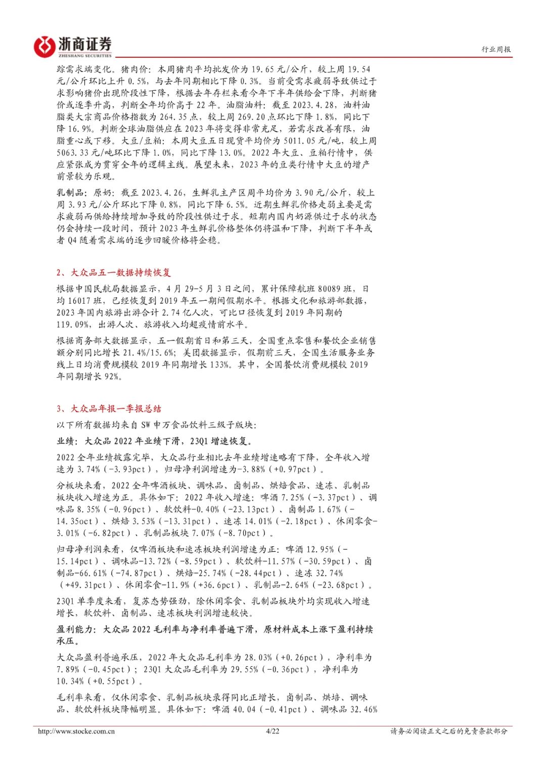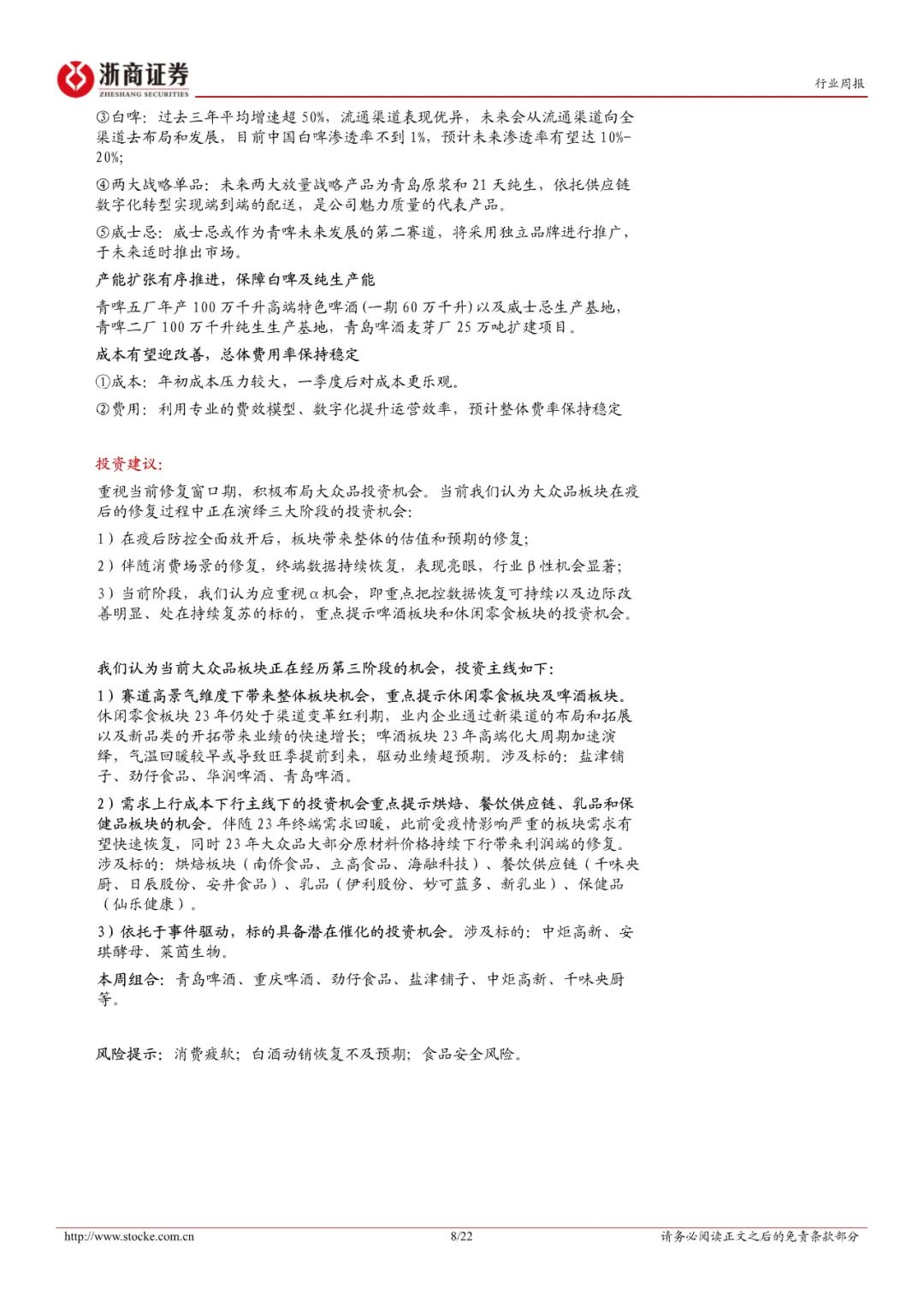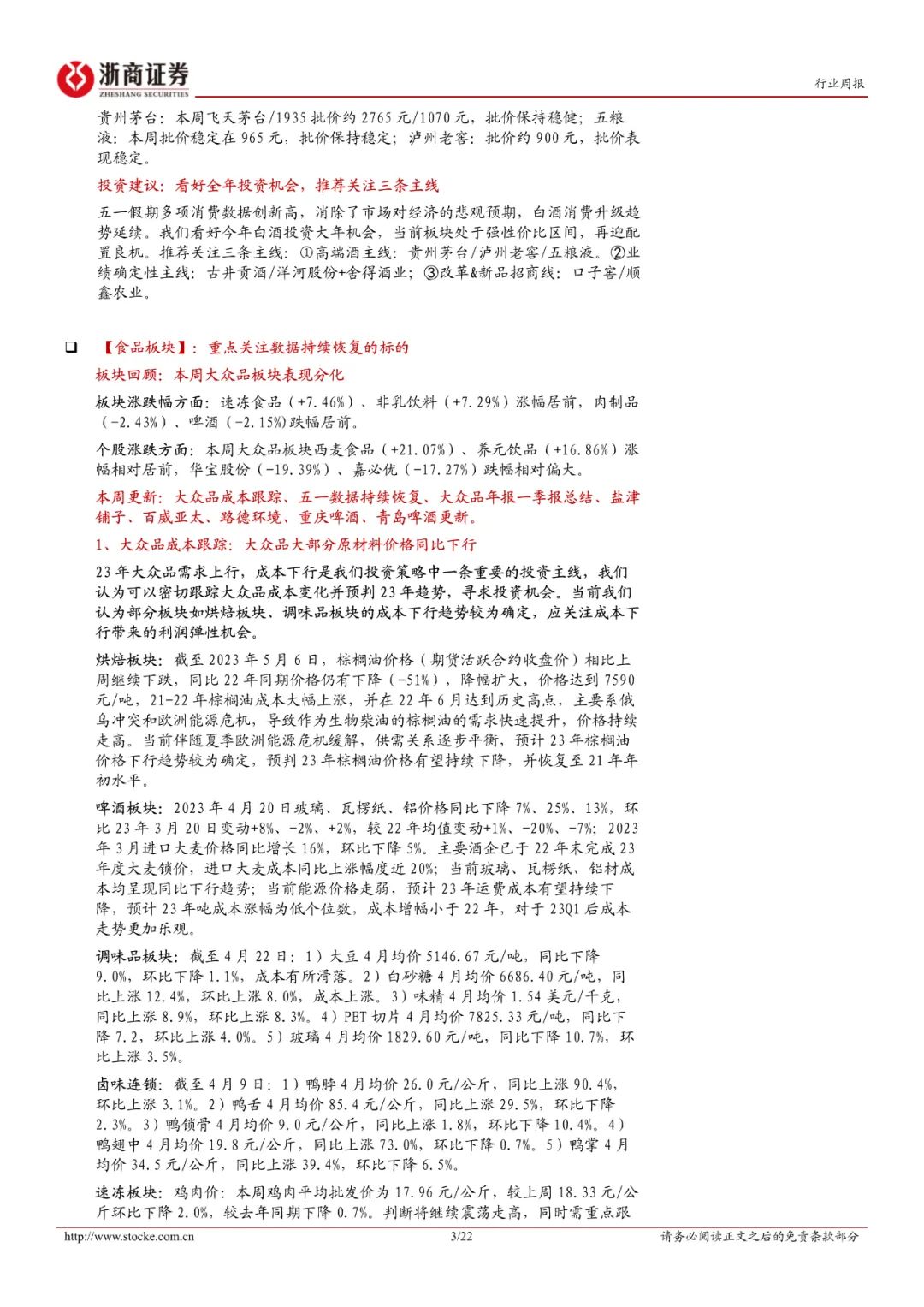 大众品板块:大众品2022年业绩下滑,23Q1增速恢复,23Q2有望迎逐季改善。五一数据恢复,叠加成本端有望边际向好,建议积极布局大众品板块投资机会。重点关注经营数据加速改善、二季度有催化剂的标的,如啤酒板块、休闲零食板块等。本周组合:青岛啤酒、重庆啤酒、盐津铺子、劲仔食品、中炬高新、千味央厨等。