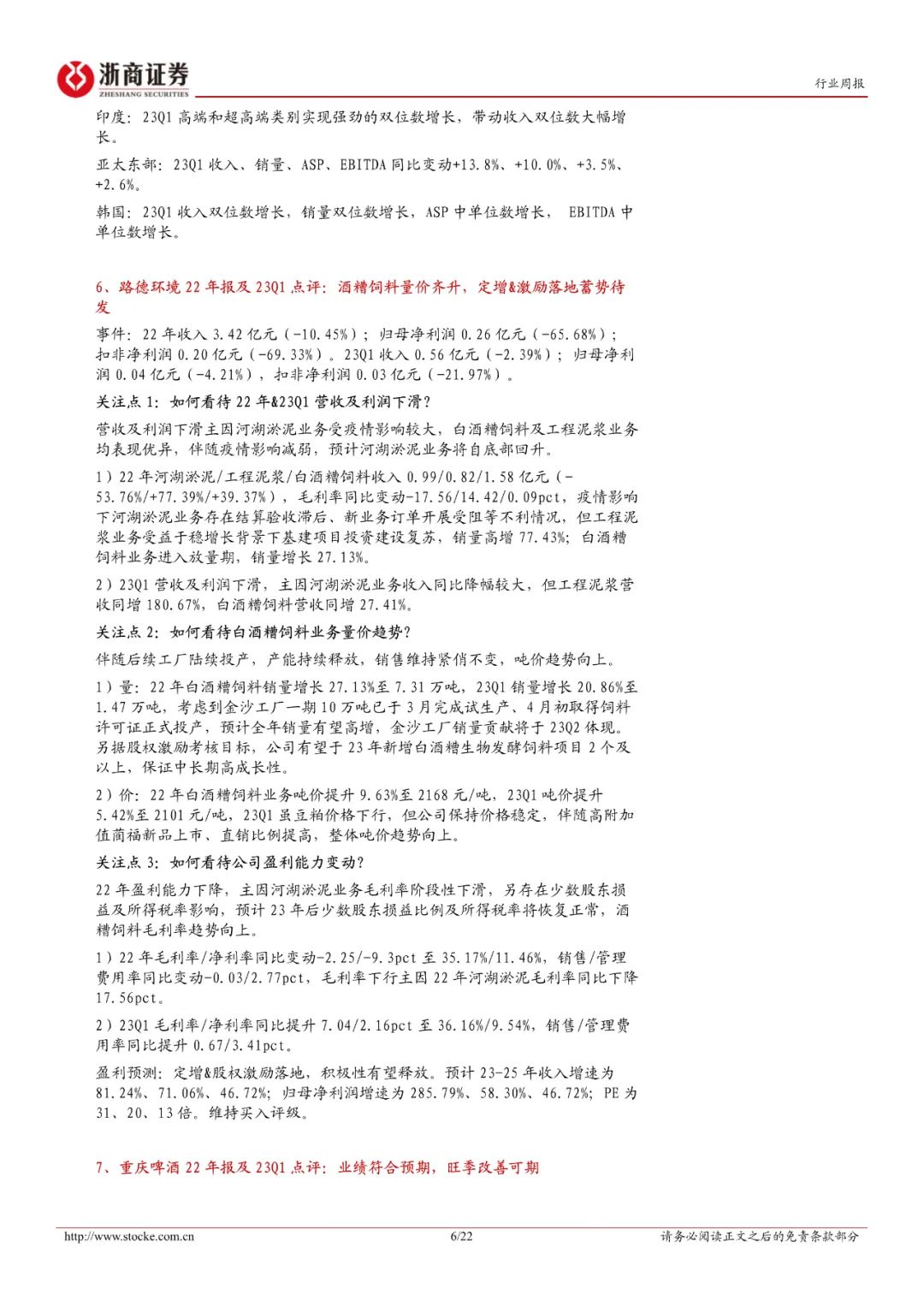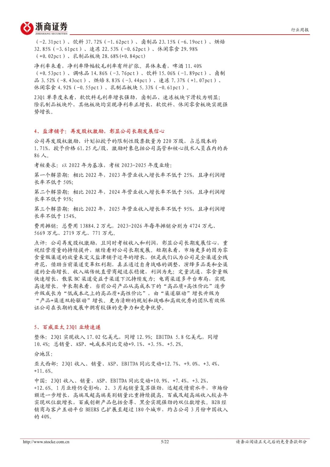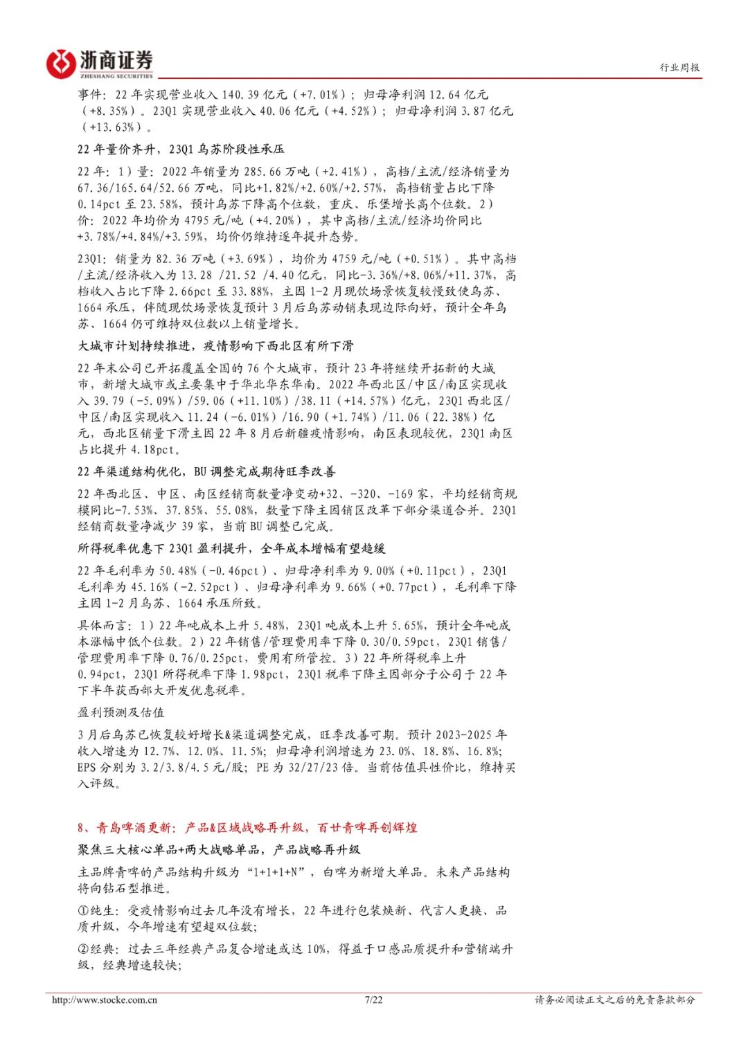 大众品板块:大众品2022年业绩下滑,23Q1增速恢复,23Q2有望迎逐季改善。五一数据恢复,叠加成本端有望边际向好,建议积极布局大众品板块投资机会。重点关注经营数据加速改善、二季度有催化剂的标的,如啤酒板块、休闲零食板块等。本周组合:青岛啤酒、重庆啤酒、盐津铺子、劲仔食品、中炬高新、千味央厨等。