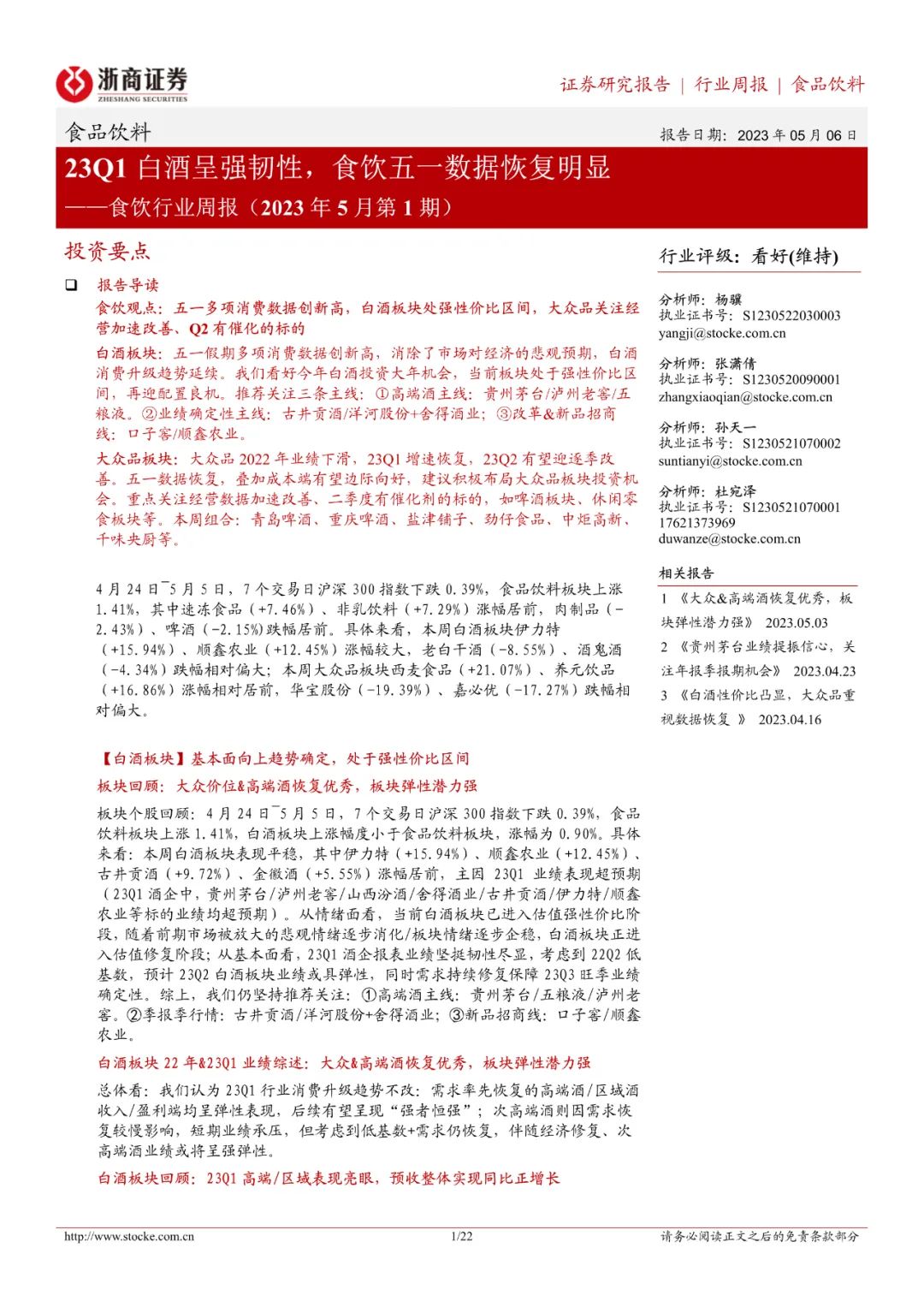 食饮观点:五一多项消费数据创新高,白酒板块处强性价比区间,大众品关注经营加速改善、Q2有催化的标的白酒板块:五一假期多项消费数据创新高,消除了市场对经济的悲观预期,白酒消费升级趋势延续。我们看好今年白酒投资大年机会,当前板块处于强性价比区间,再迎配置良机。推荐关注三条主线:①高端酒主线:贵州茅台/泸州老窖/五粮液。②业绩确定性主线:古井贡酒/洋河股份+舍得酒业;③改革&新品招商线:口子窖/顺鑫农业。
