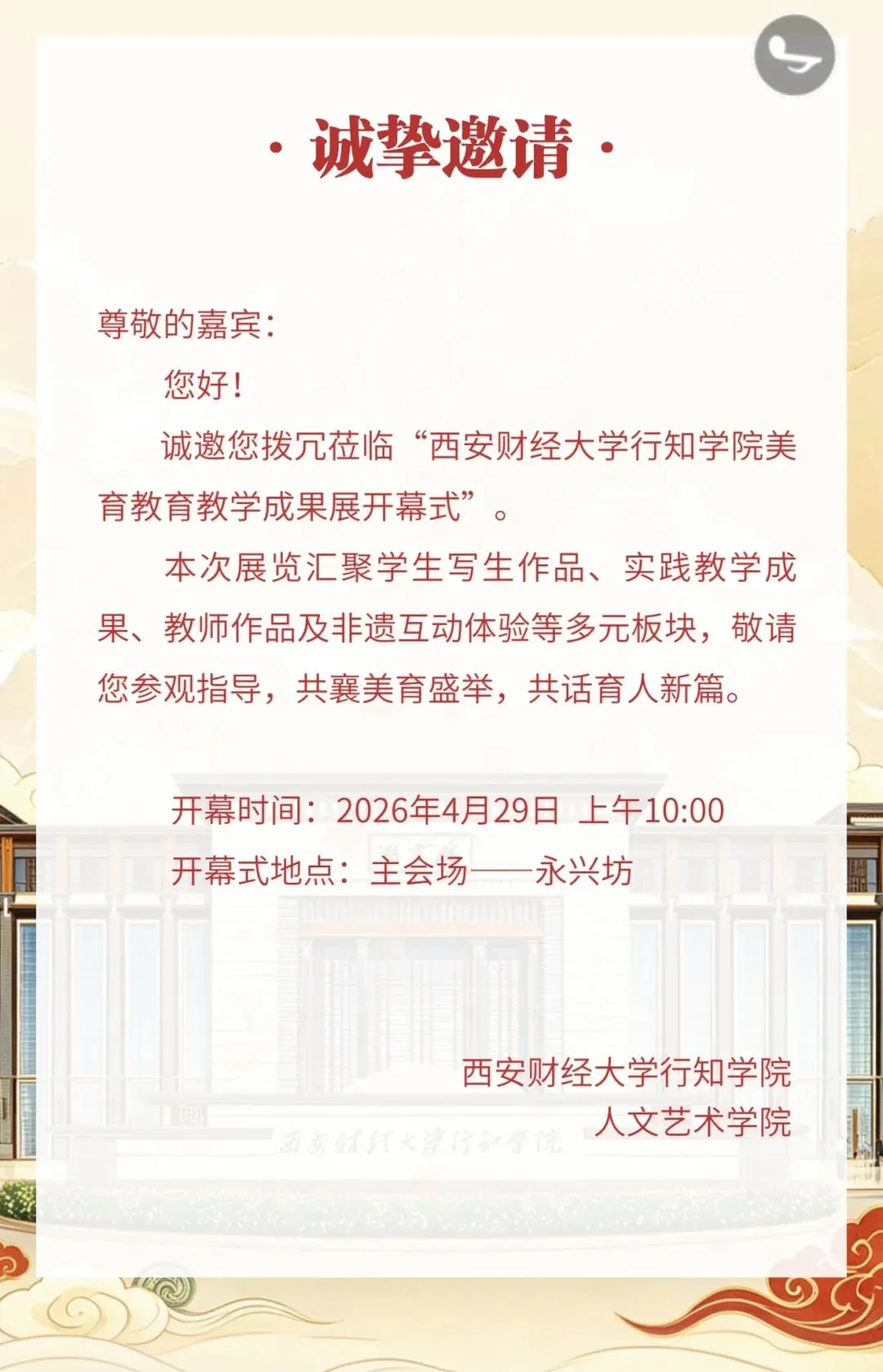 这一次,我们把课堂搬到永兴坊。走出校园,走向市井街巷,让美育成果在青砖黛瓦间自然呈现,在往来行人的目光中与城市悄然对话。这不仅是一次教学成果的集中展示,更是教育面向社会、面向生活的一次自觉转身。四月将尽,春意正浓。诚邀您步入永兴坊,在市井街巷的一隅,遇见美,遇见年轻的光。