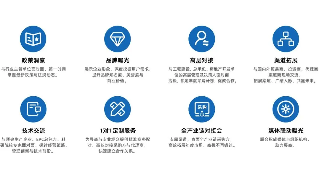 央企及地方总包商参与度高,供采双方对接、采购观展团,特邀EPC工程总承包单位洽谈区内对接。组织以集团为单位的采购观展团。提前登记采购单位拟在建工程项目、工程采购计划需求;提前提供展商展品宣传;现场VIP采购单位宣传册,通过采购方调研反馈,为展商提供更高附加值的专属服务;提前调研采购单位考察供应商意愿,展后按计划有序安排,为展商提供增值服务。