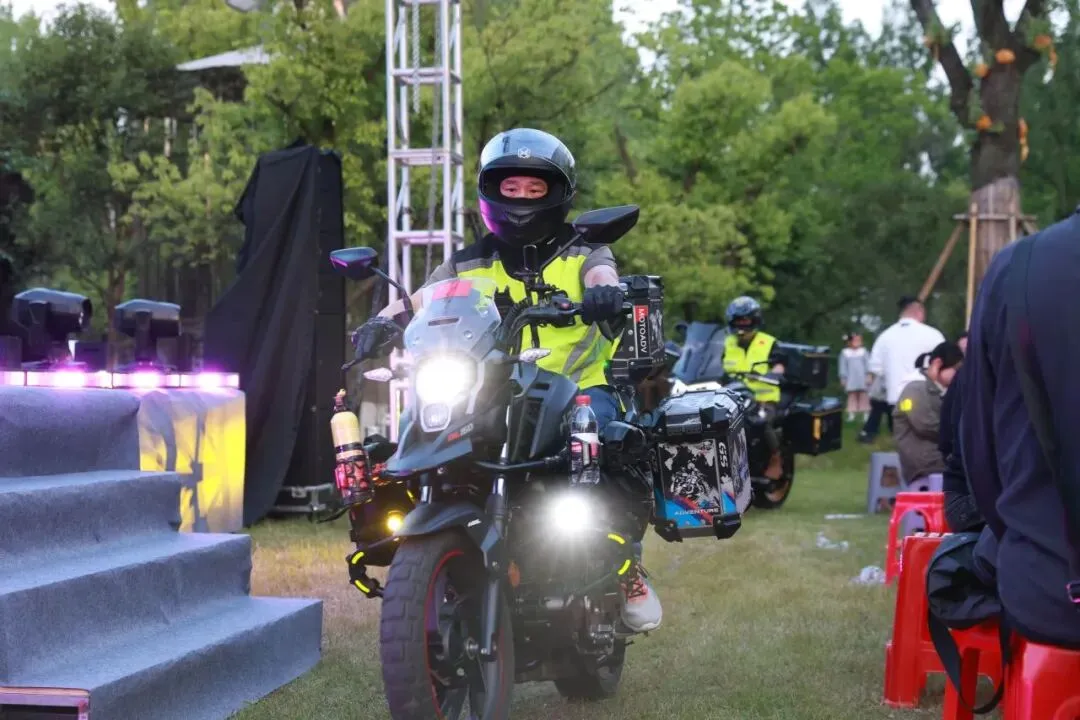 风驰摩友会带来的热血开场秀点燃全场激情。伴随着激昂的音乐,摩托车队绕场三周,以整齐划一的队形和飒爽英姿,向大美六郎致敬,也为当晚的盛会拉开序幕。
