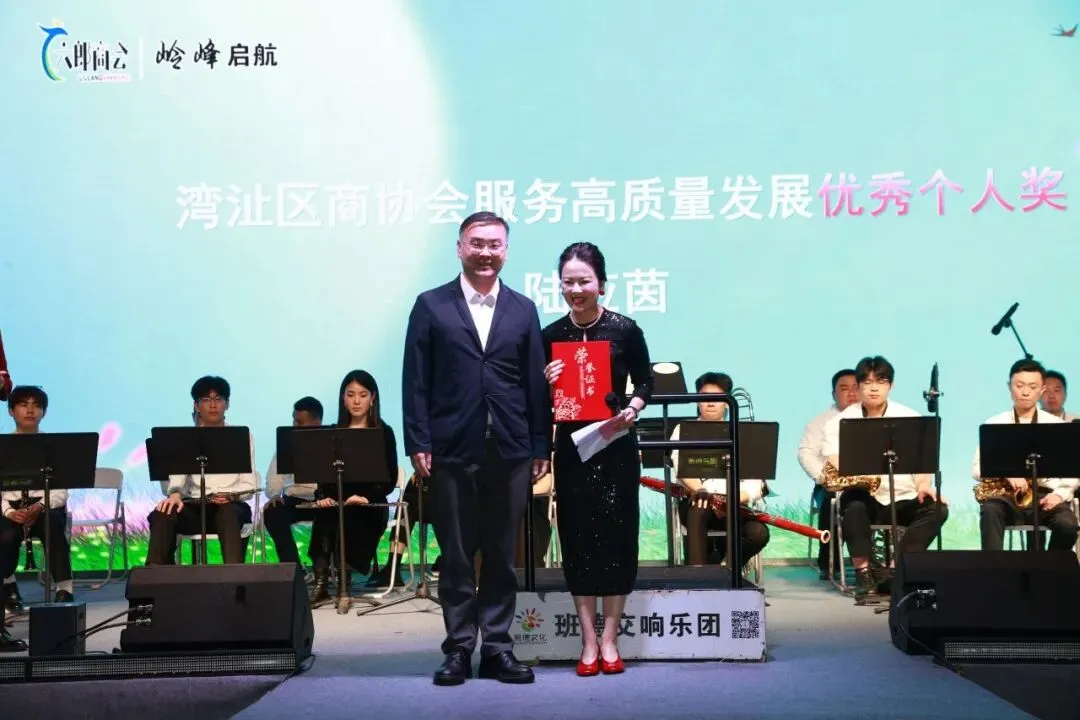 在推介会进行环节中,区委统战部为表现突出的个人和集体做出了表彰活动。区委统战部常务副部长崔强为六郎商会副会长陆应茵颁发 “湾沚区商协会服务高质量发展优秀个人” 证书。