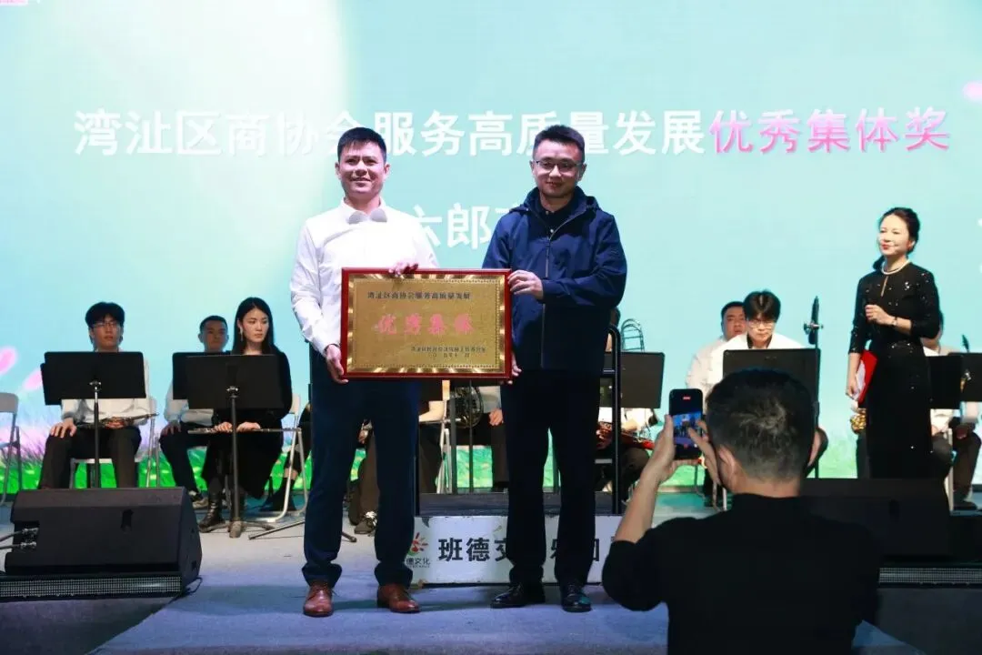 区委常委、统战部部长陶涛为六郎镇商会颁发 “湾沚区商协会服务高质量发展优秀集体” 荣誉证书,会长夏晓冰上台领奖。两项荣誉的颁发,充分体现了区委统战部对六郎商会工作的高度认可,也激励着商会全体成员再接再厉、再创佳绩。
