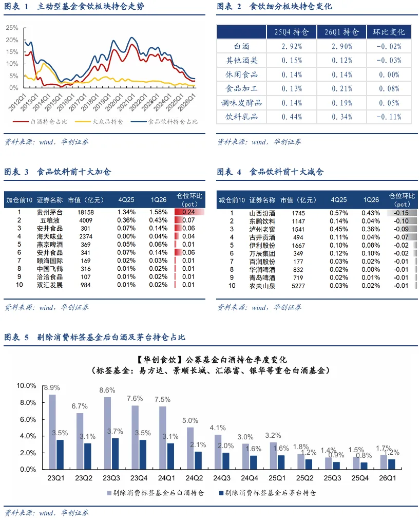 食品饮料:26Q1食饮基金持仓进一步下降,白酒基本持平,大众品略有减配。根据wind偏股主动型基金近期披露的26Q1持仓数据,食品饮料板块持仓占比3.9%,环比下降0.1pct、已连续10个季度下降,接近15年底部持仓水平。其中白酒持仓2.9%,环比下降0.02pct;大众品持仓1.0%,环比下降0.10pct,其中软饮料/啤酒板块持仓降幅较大,而调味发酵品/预加工食品持仓分别环比提升0.05/0.07pct。此外,保健品和烘焙食品小幅降低,熟食小幅升高。从大类行业对比来看,食饮持仓位居申万一级行业第八、环比上升1名,基金重仓前十大个股中仅有贵州茅台来自食饮板块.