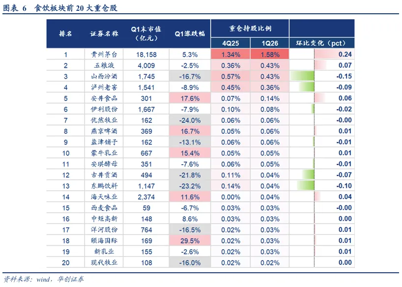 分个股来看,持股占比向头部集中,茅台虹吸效应明显。食饮板块前20大重仓股中共有6家白酒公司,持仓比例相对靠前。茅台/五粮液/洋河股份持仓环比上升0.24/0.07/0.01pct,茅台表现明显好于行业整体、对资金的虹吸效应明显,山西汾酒/泸州老窖/古井贡酒占比持续减少,Q1环比分别下降0.15/0.09/0.07pct,主要系经营边际承压所致。
