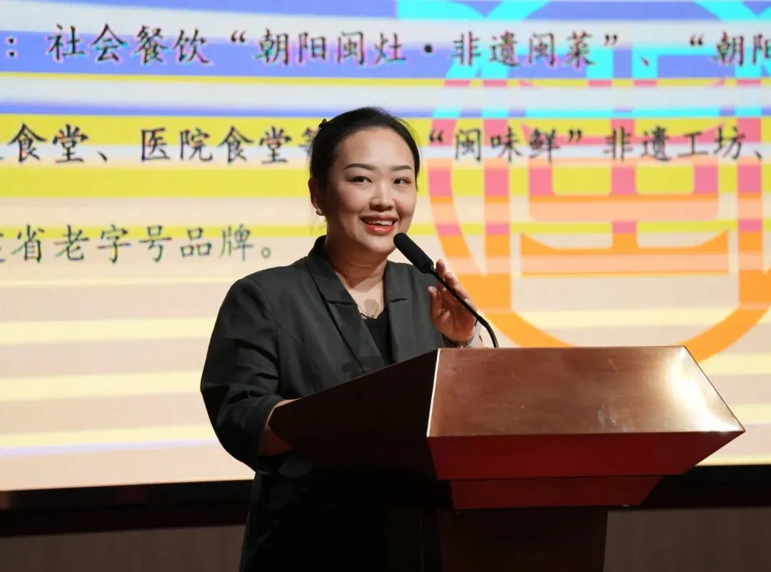 福州鑫朝阳餐饮管理服务公司总经理郑碧娟介绍朝阳闽灶·非遗文化闽菜馆,呈现非遗美食与闽菜文化融合的创新实践。