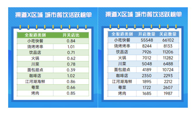烧烤乘势而上,居全渠道开店量榜单第二位,淄博烧烤热情持续,带动了当地和邻市济宁、临沂,三地烧烤开关店比超2.0。