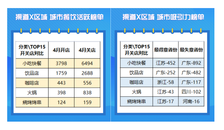 4月,咖啡店开店激情褪去,不足3月开店量的一半,关店量与上月基本持平。饮品店和火锅关店数量也有明显减少。江苏、广东上榜次数最多,既开店得意,又关店失意。