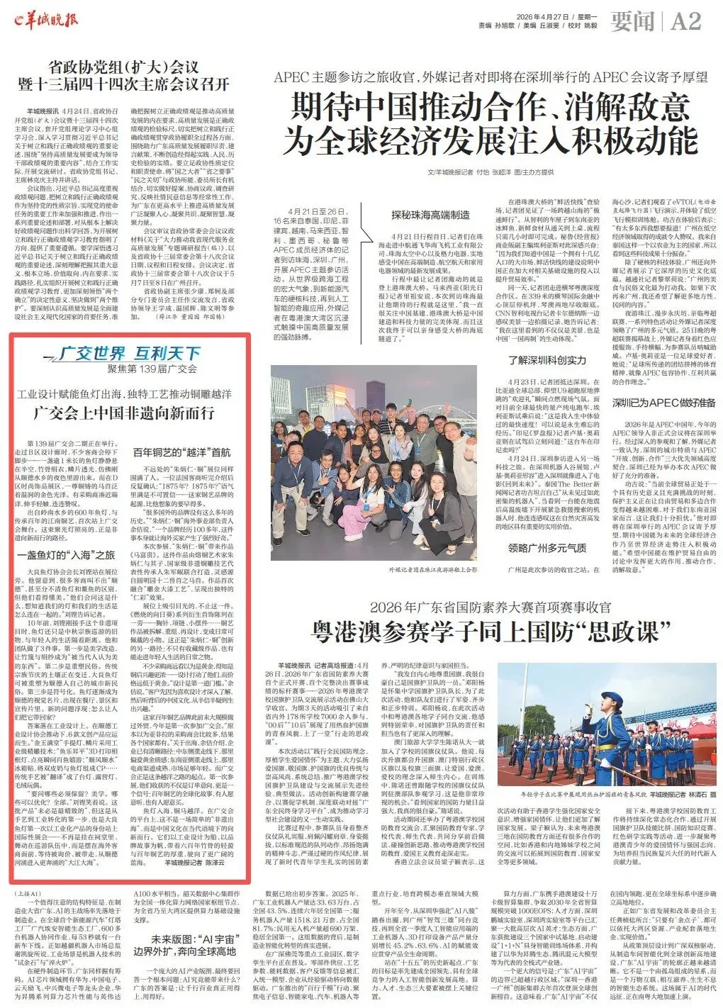 4月27日,羊城晚报刊发《广交会上中国非遗向新而行》,内容如下: