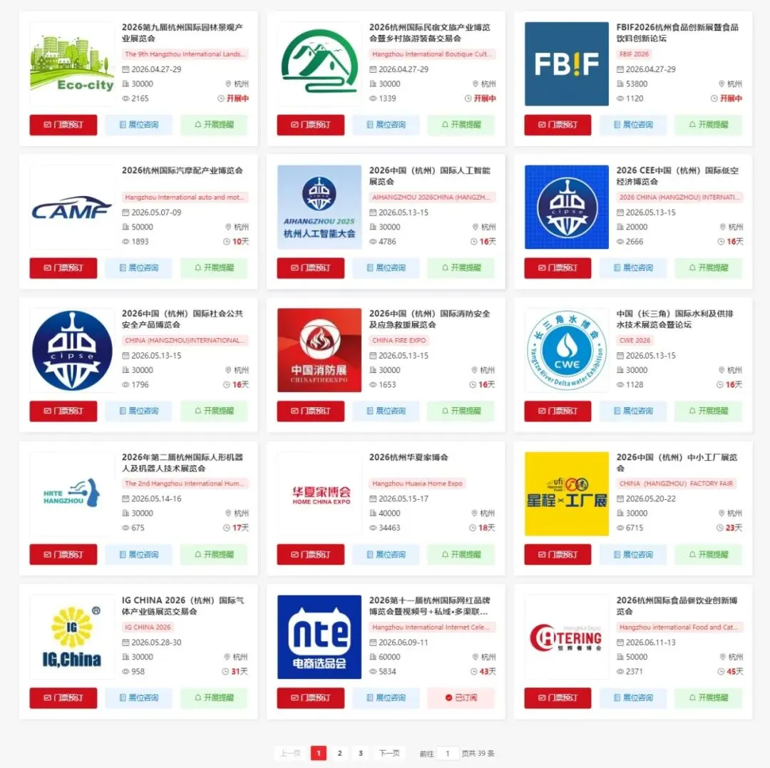 2026年杭州下半年将举办多场重要的展会活动,涵盖了食品、园林、民宿、汽车配件、安全、消防、智能制造、水利、低空经济、机器人、家具、日用品、工业、国内电商、酒店用品、食品、餐饮、汽车、内衣、纺织、袜业、服装、家具、婚博会、跨境电商、储能、食材、国内电商、美容、文化教育、生物发酵、清洁用品、泵阀、制冷、照明、国内电商、光电激光展等30多个领域。小编为大家整理了2026下半年杭州展会时间表,希望能帮助你规划行程。末文获取杭州展会门票预约入口~(展前限时免费预约)