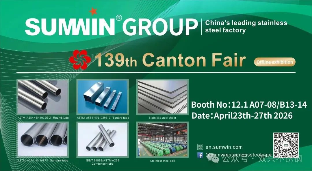 At this Canton Fair, Sumwin Group has meticulously prepared four major categories of products: stainless steel food tubes (A270), stainless steel industrial welded tubes, stainless steel structural tubes (A554), and stainless steel coils. We will fully demonstrate our technical strength and product charm to international friends and buyers. Welcome to exchange ideas on site!