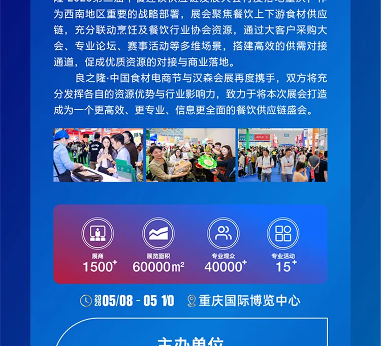 为了推动中餐连锁供应链的优化与升级、助力食材餐饮行业高效发展,5月8-10日在重庆国际博览中心,良之隆食材电商节将举办良之隆·2026中餐连锁供应链发展大会暨第三届中国渝菜食材电商节。