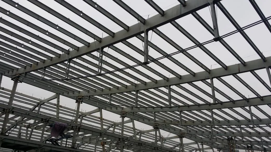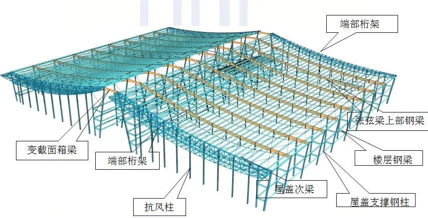屋盖两端采用立体管桁架,其余位置采用下凹形弦支梁结构,由上弦下凹箱型截面梁、空腹H型钢撑杆和下弦双拉索构成。弦支梁跨度81m,共计8榀,榀距18m。弦支梁两端通过成品球铰支座与钢管砼柱顶相连。
