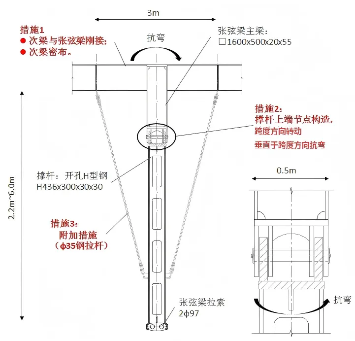 为了解决下凹形弦支梁的面外稳定问题,本案采取了三项措施,分别如下: