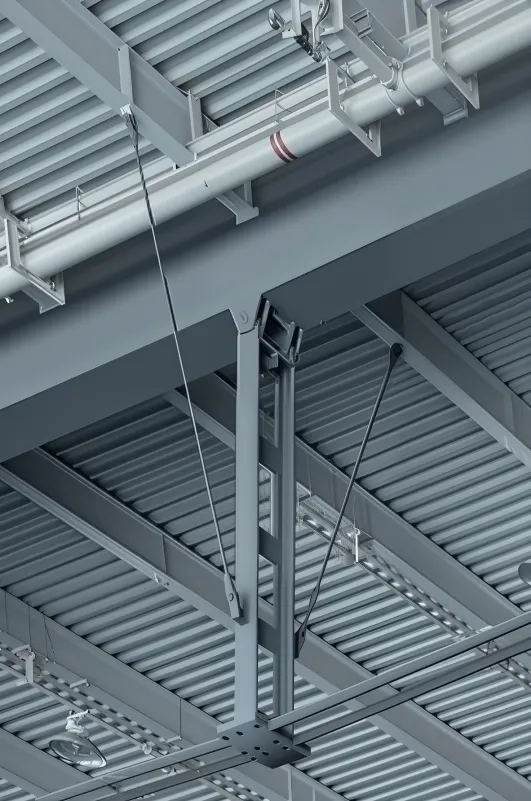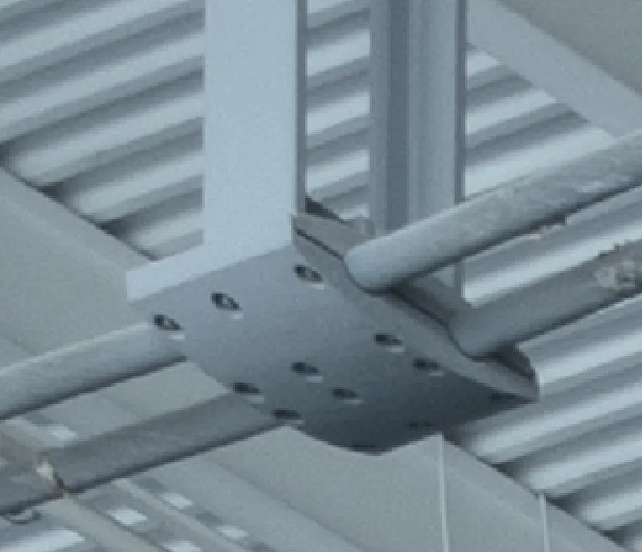 前面2项措施已可保证下凹形弦支梁平面外稳定性,不过长沙是出现过08年雪灾等意料之外的极端情况的城市,设计师还是在计算之外,增加了附加稳定措施来提高结构安全冗余度。对这一点谨慎,建筑师也非常理解,和结构设计师一起比较了的几种稳定设计方案的效果细节。经过多轮讨论和比较,最终采用了拉杆式隅撑方案。隅撑对称布置,采用 650 级、φ35 钢拉杆,上端间距3m,下端位于撑杆最下方一个洞口之上,既简化了弦支梁索夹节点,又通过结构细节满足建筑师对室内观感的追求。