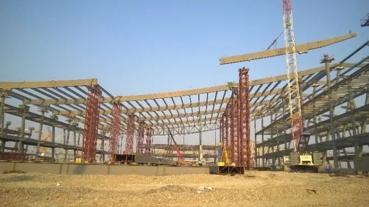 展馆采用全钢结构(柱采用钢管砼柱),两侧的设备间钢框架结构为大空间屋盖结构提供支承。展馆81mX163m无柱大空间屋盖选型是本案的核心问题。