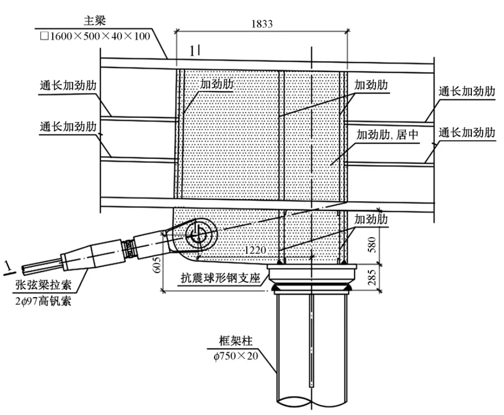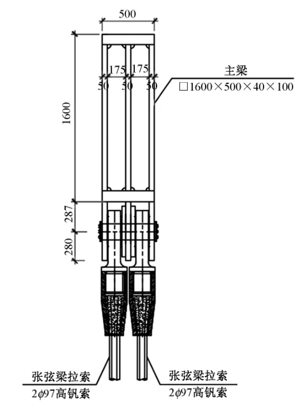 下弦采用2根直径Φ97的高钒镀层拉索,以与空腹桁架式撑杆匹配,拉索钢丝强度1770MPa。