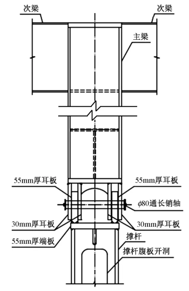 2)采用空腹H型钢撑杆,撑杆上端与上弦箱型梁通过双耳板销轴连接。