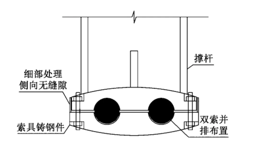 下凹形弦支梁下弦索处于不稳定态,为了提高索的侧向约束能力,采用空腹H型钢撑杆,每榀共有9根。撑杆上端通过单向销轴与上弦梁相连(双耳板,沿跨度方向可转动,垂直于跨度方向不可转动)。撑杆下端通过专用索夹与两根拉索相连。