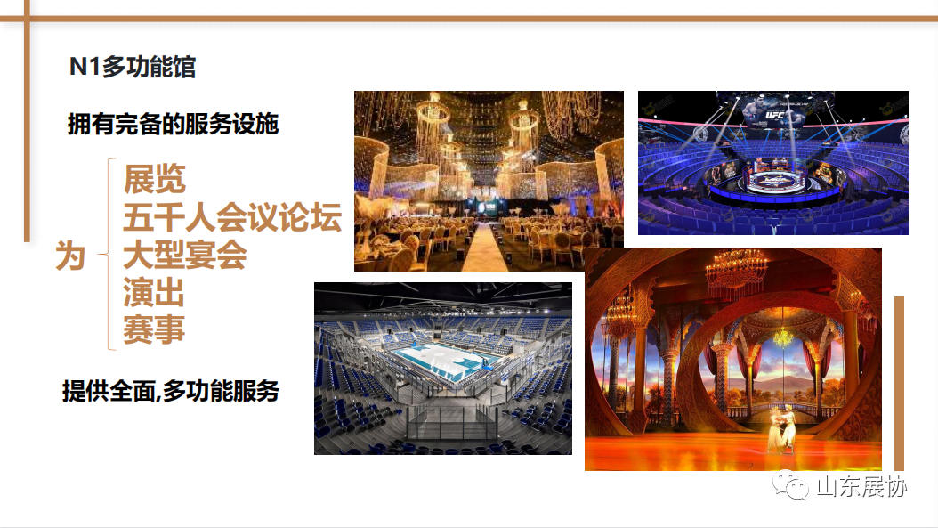 N1多功能馆:单馆建筑面积15000㎡,配备中央厨房。通过分隔变形,可以举行5000人规模的大型会议论坛、大型宴会、演出、赛事等各种大型室内活动.