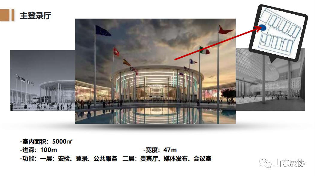登录大厅:会展登录大厅作为项目标志性建筑,造型新颖、大气。登录厅可用于开幕式、会议论坛的面积约5000㎡ 。大厅分为二层,展厅内净高18 m ,一层安检、登录、公共服务规划配有急救室、海关办公室、旅游咨询处、邮局、知识产权办公室、登记/行李寄存、咖啡厅、商务中心、警务办公室等。二层:155 ㎡贵宾厅一间、225㎡媒体发布厅一间、会议室48㎡、70 ㎡ 、310㎡共3间。