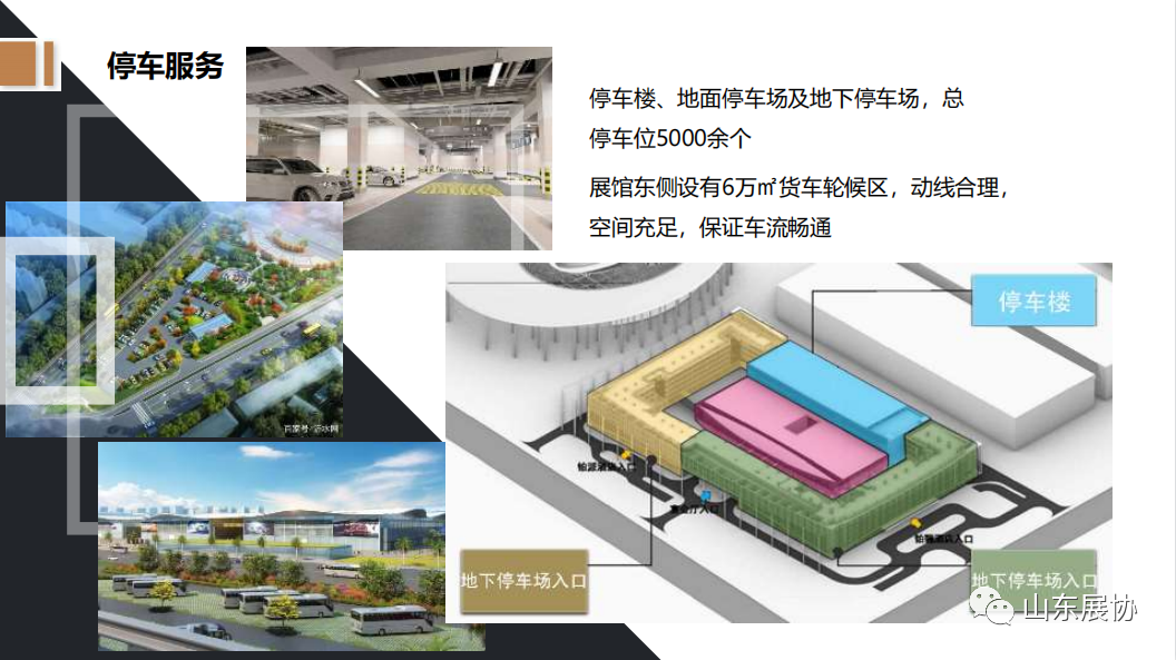 停车服务:展馆地面停车场及地下停车场、停车楼,总停车位5000余个。展馆东侧设有货车轮候区,动线合理, 空间充足,保证车流畅通。