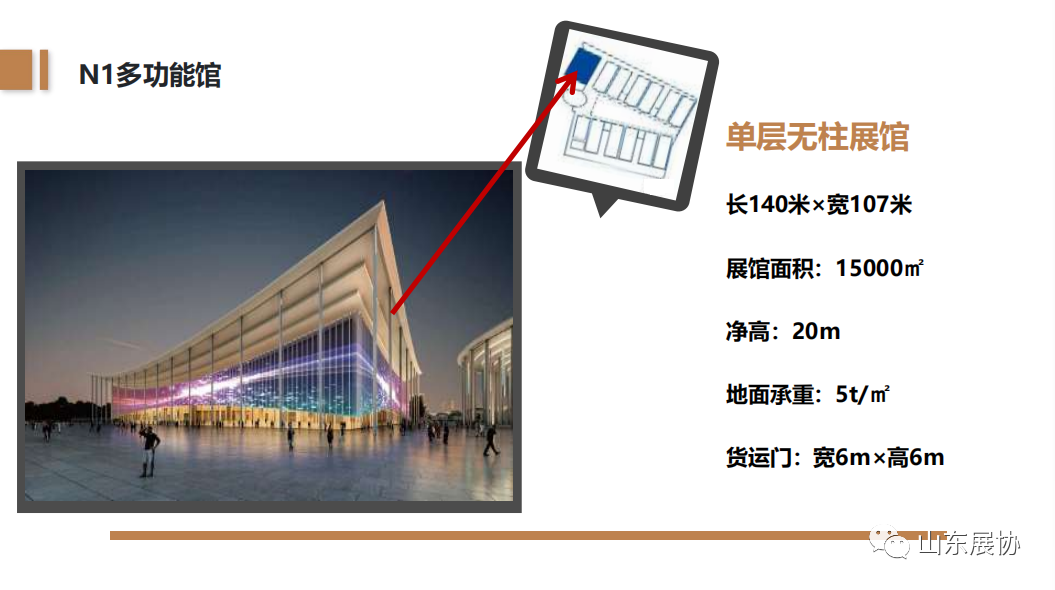 N1多功能厅:单层无柱展馆 ,长140米×宽107米,展馆面积:15000㎡, 展厅内净高:15 m ,地面承重:5t/㎡,可以搭建800个国际标准展位 。多功能厅配有150 ㎡组委会办公室一间,110 ㎡ VIP接待室一间,二层会议室520 ㎡一间、90 ㎡两间;北辅房二层轻餐饮区面积为780㎡等完备的服务设施可以为展览、大型会议论坛、大型宴会、演出赛事等提供全面、多功能服务。