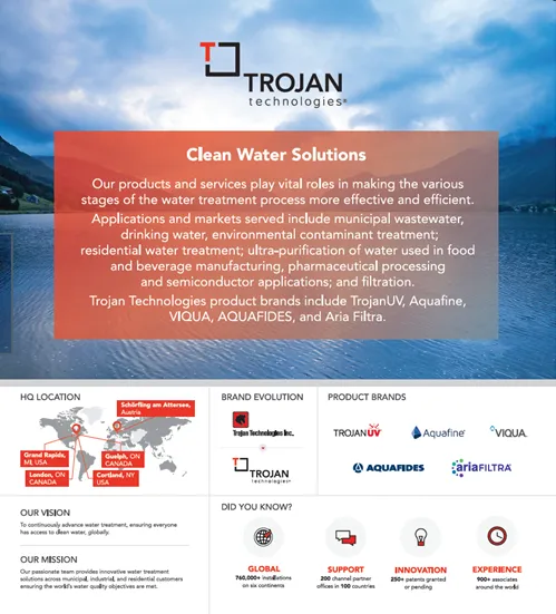 特洁安技术公司(Trojan Technologies)旗下拥有 TrojanUV、Aquafine 和 VIQUA 等知名品牌,是 Veralto 集团的重要成员。我们专注于市政污水、饮用水、工业用水、食品饮料、半导体、制药工程、养殖业、商业和民用等多个领域,以全球领先的紫外技术为依托,为全球客户提供专业的水消毒和深度氧化处理服务