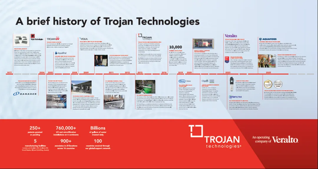 1983年,公司更名为Trojan Technologies Inc.,并成功实施首个市政污水紫外消毒项目。此后,特洁安不断扩展产品组合,推出TrojanUV系列,应用于饮用水、废水再利用、食品饮料、制药及半导体行业。