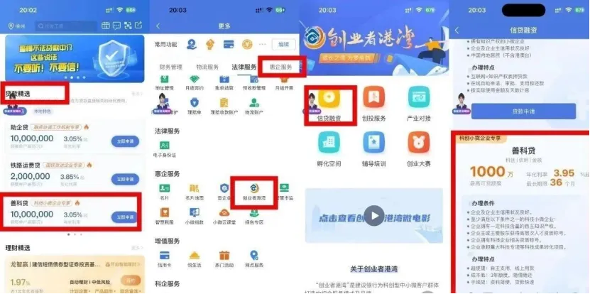 路径 2:首页 → 更多 → 创业者港湾 → 信贷融资 → 善科贷
