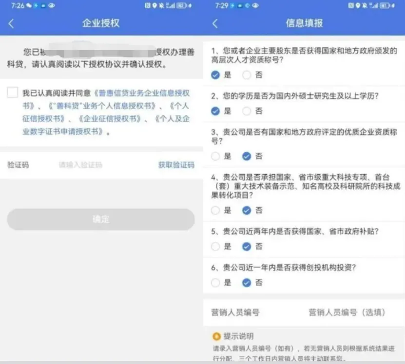 进入产品页后完成企业授权,阅读并同意《普惠信贷业务企业信息授权书》《善科贷个人信息授权书》《个人 / 企业征信授权书》《个人及企业数字证书申请授权书》,输入验证码提交。