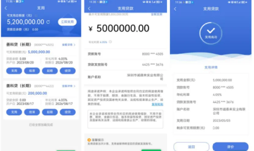 1、贷款支用:签约后可随时支用,支持全额支用,按实际支用金额计息,资金转入贷款发放账户