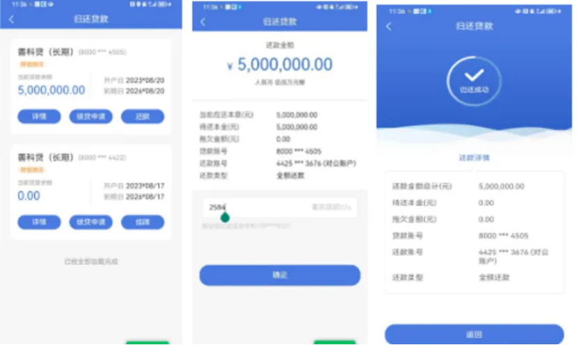 2、归还贷款:支持随时还款,可选择全额还款,页面显示待还本金、拖欠金额等信息